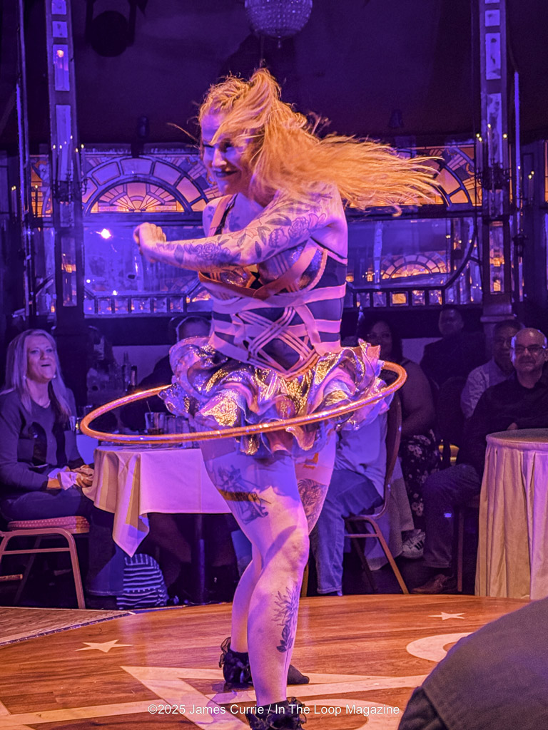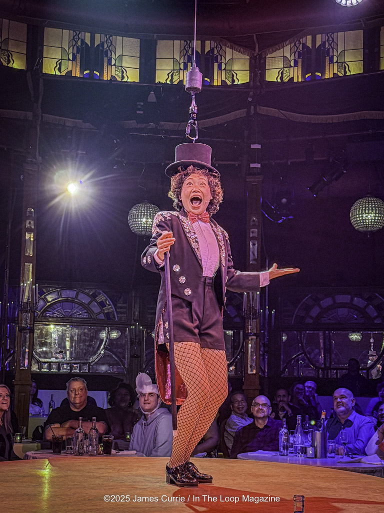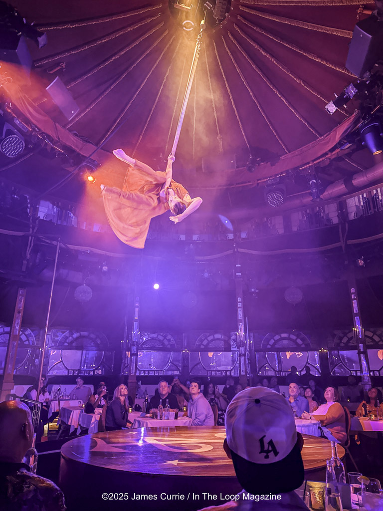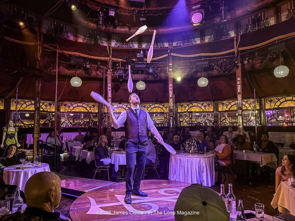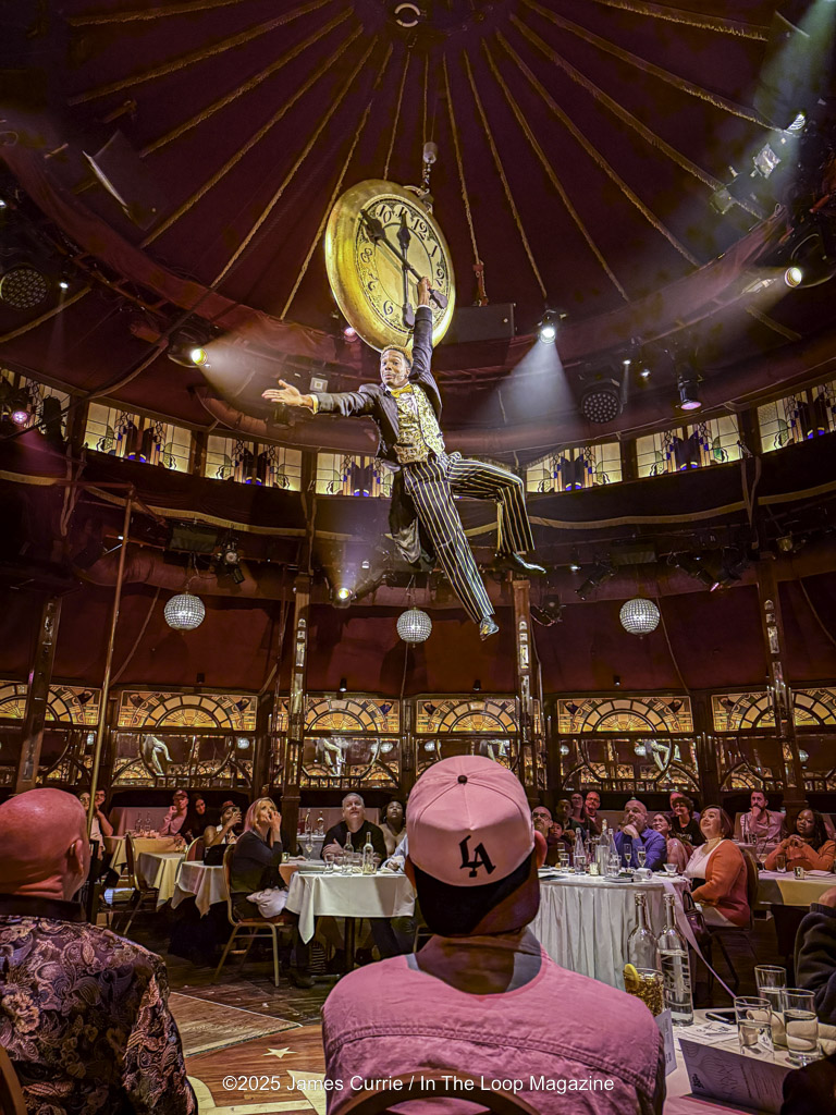 Located in the heart of the downtown theatre district on Randolph, the instant guests enter the velvet-draped spiegeltent, they’re transported into a world that feels both fantastical and familiar — a miniature society where music, motion, and mayhem collide. Beneath the glitter and laughter, Teatro Zinzanni pulses with an undercurrent of humanity, subtly echoing the complexities of our own times: the tension between classes, the resilience of the working people, and the shared longing for belonging in a divided world. The experience unfolds around the audience — literally — as performers swing, juggle, and croon mere feet from diners’ tables.