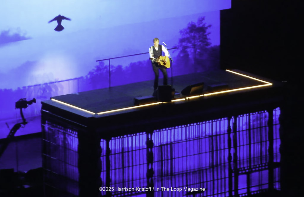 From there, it was a full sweep of his legendary songbook, drifting through eras, bands, and decades with effortless charm. The Beatles, Wings, his solo catalog every chapter was represented. “Maybe I’m Amazed” had the crowd swaying in a collective emotional trance; “Lady Madonna” brought a burst of joyous piano-driven energy; “Get Back” shook the room with the same rebellious fire it carried in 1969. Even the deep cuts got their moment. McCartney broke into “Coming Up (Peter Gunn),” a playful and unexpected highlight that delighted longtime fans who knew exactly how rare it was. “Blackbird came and McCartney took center stage solo for it. Rising up from the riser surrounded by a video screen with blue colors and blackbirds flying around.