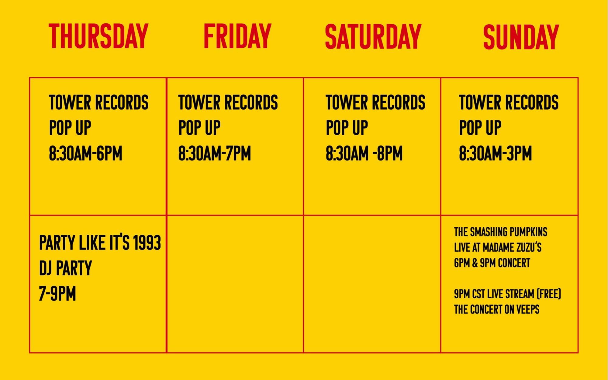 Relive the iconic Tower Records moment with us for a popup experience September 14, 2023 – September 17, 2023 as we transform Madame ZuZu’s in Highland Park, IL into Tower Records 1993 and celebrate three decades of this legendary album.