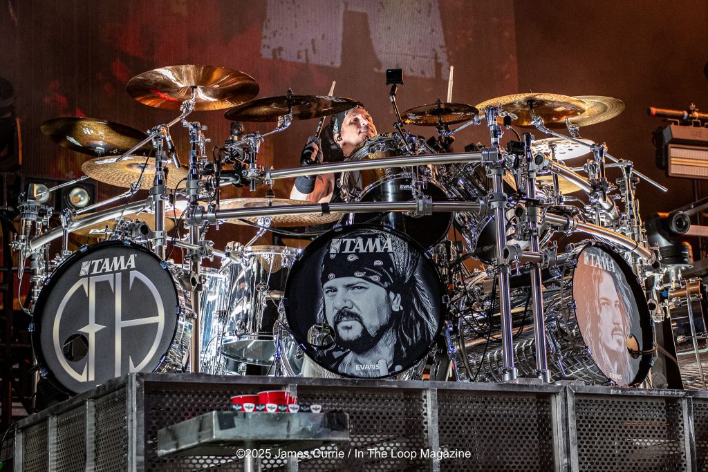 Behind the kit, Benante delivered a thunderous performance that honored Vinnie Paul’s signature style while adding his own flair. His drums sounded absolutely massive, particularly the kick drums, which seemed to use triggers just like Vinnie once did, giving them that unmistakable punch and clarity in the mix. The kit itself was a heartfelt tribute: emblazoned on the kick drum heads were images of Dimebag and Vinnie, a visual reminder that their spirits were right there on stage with the band.