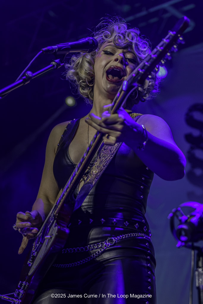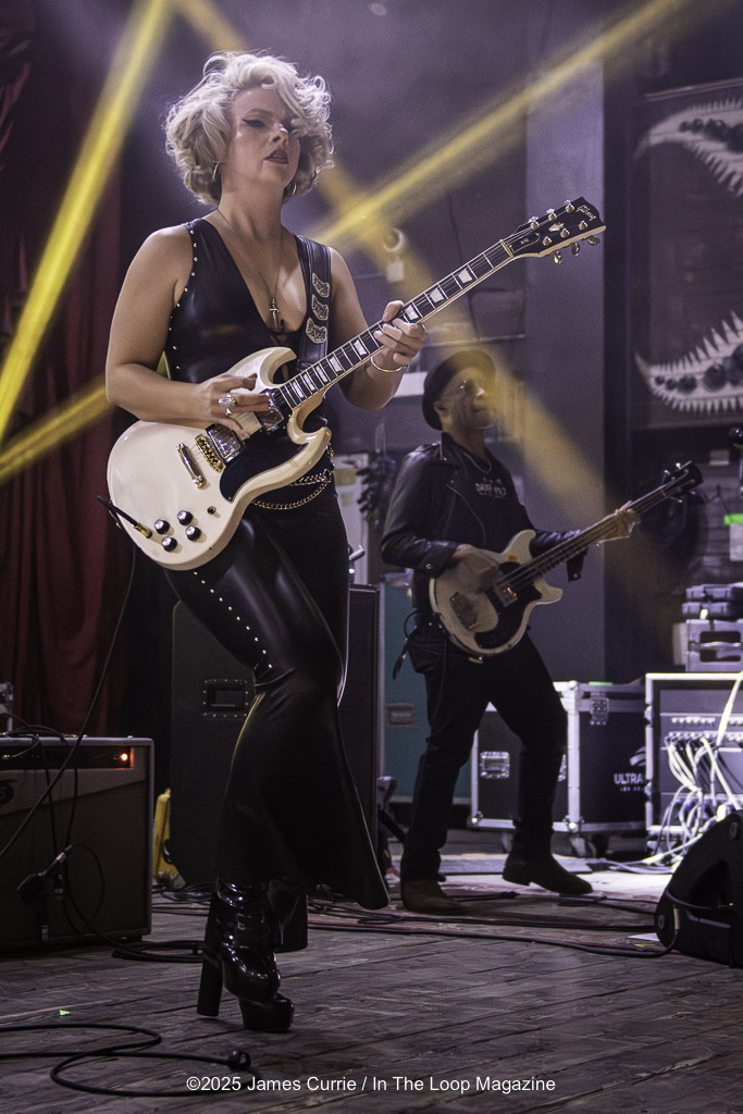 Fish arrived in a slick black studded panes and laced tank top, silver-accented 4″ healed boots, and that unmistakable Gibson SG guitar draped on her from her tech like a weapon. Throughout the night she changed guitars every song one that included her cigar box guitar during “Bulletproof”. Her presence was immediate and cinematic, the kind of entrance that feels like a curtain drop in a film.